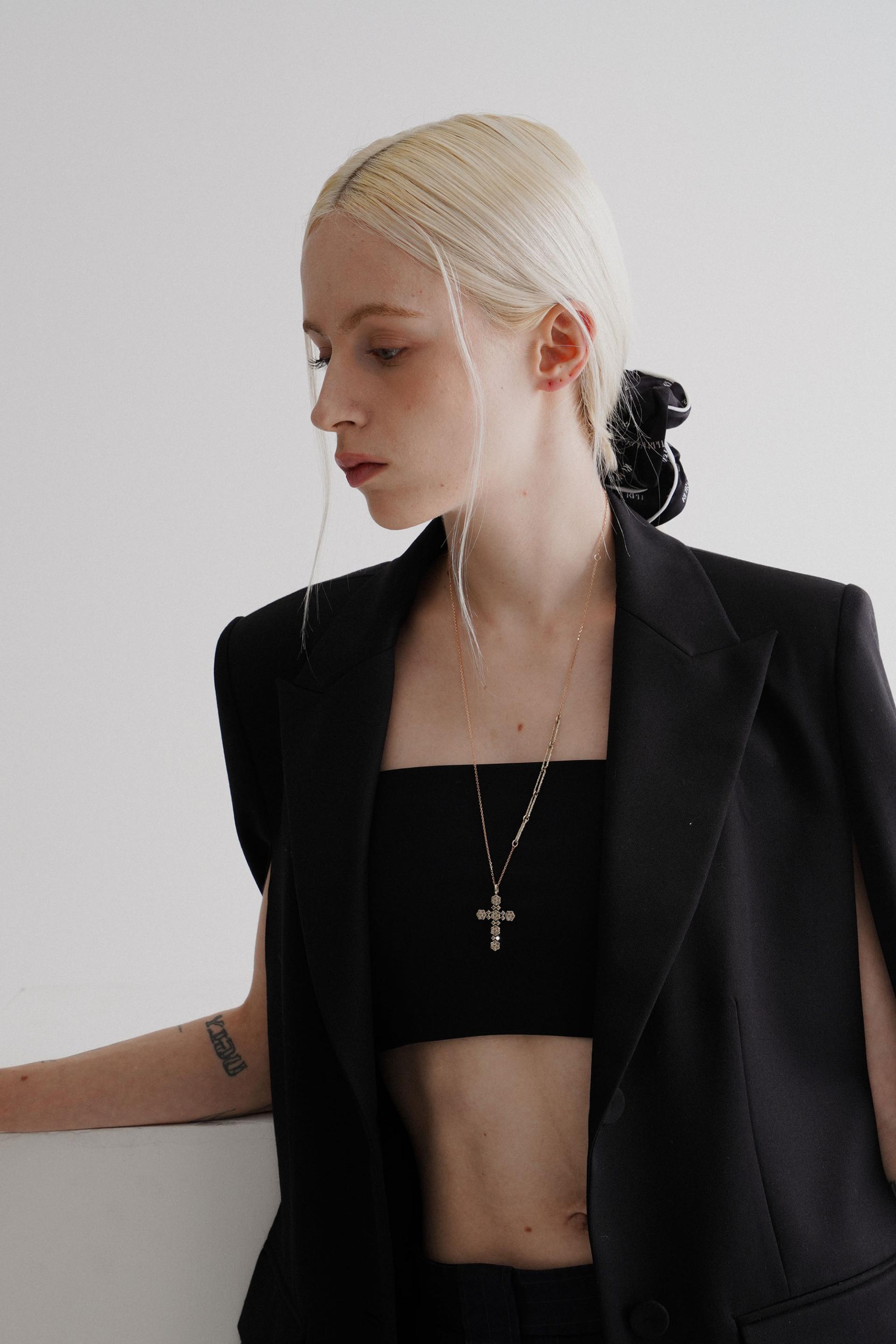 - 와이드한 사이즈의 십자가에 작은 다이아몬드들이 촘촘하게 셋팅되어 있는 유니크한 십자가 목걸이 입니다. 팬던트 고리장식이 커서 다양한 체인에 활용하기 좋은 팬던트 입니다. (체인미포함)